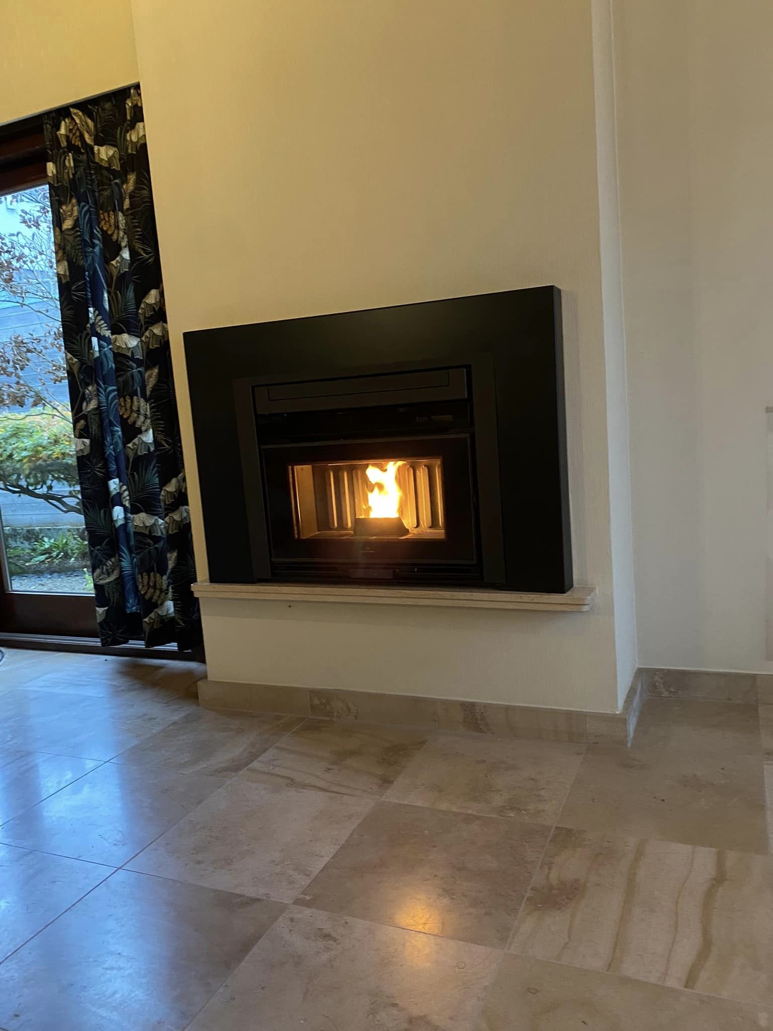 Deze moderne inbouwhaard combineert de uitstraling van een klassieke haard met de efficiëntie en het gemak van pelletverwarming.
